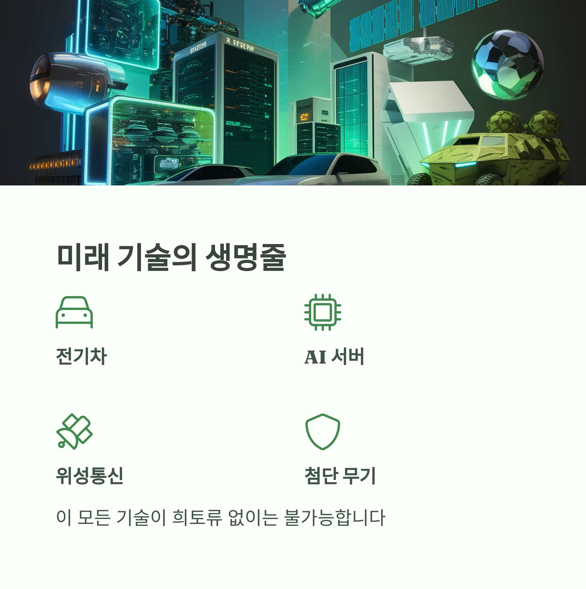 이 희토류는 스마트폰, 전기차, 반도체, 태양광 패널, 군사용 장비(스텔스 전투기, 핵잠수함)까지 거의 모든 첨단 산업에 필수로 들어갑니다. 즉, 희토류 없이는 현대 기술이 돌아가지 않는다고 해도 과언이 아닙니다.