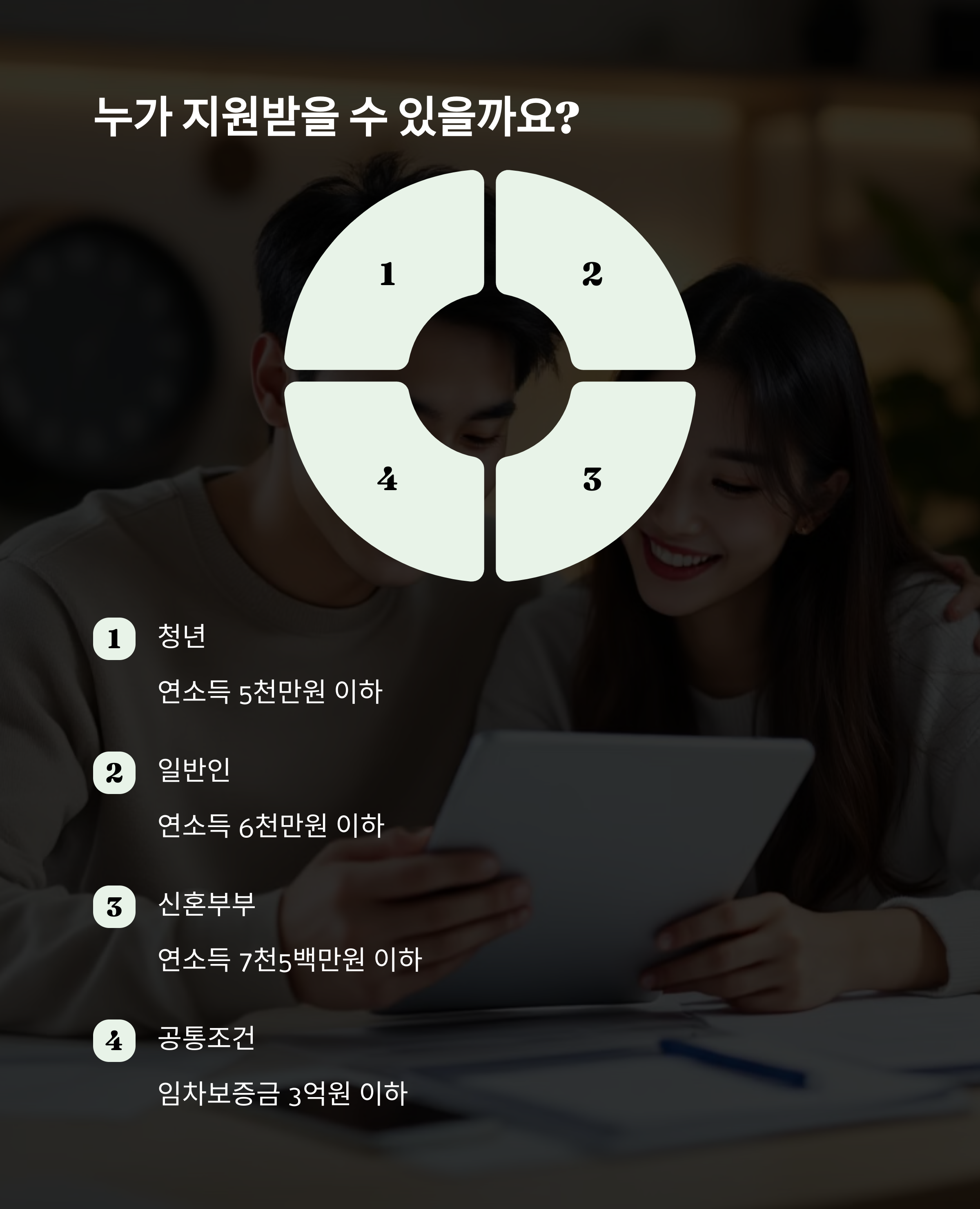 청년 외 일반인은 6천만 원 이하, 신혼부부는 7천5백만 원 이하의 조건을 만족해야 하며,
