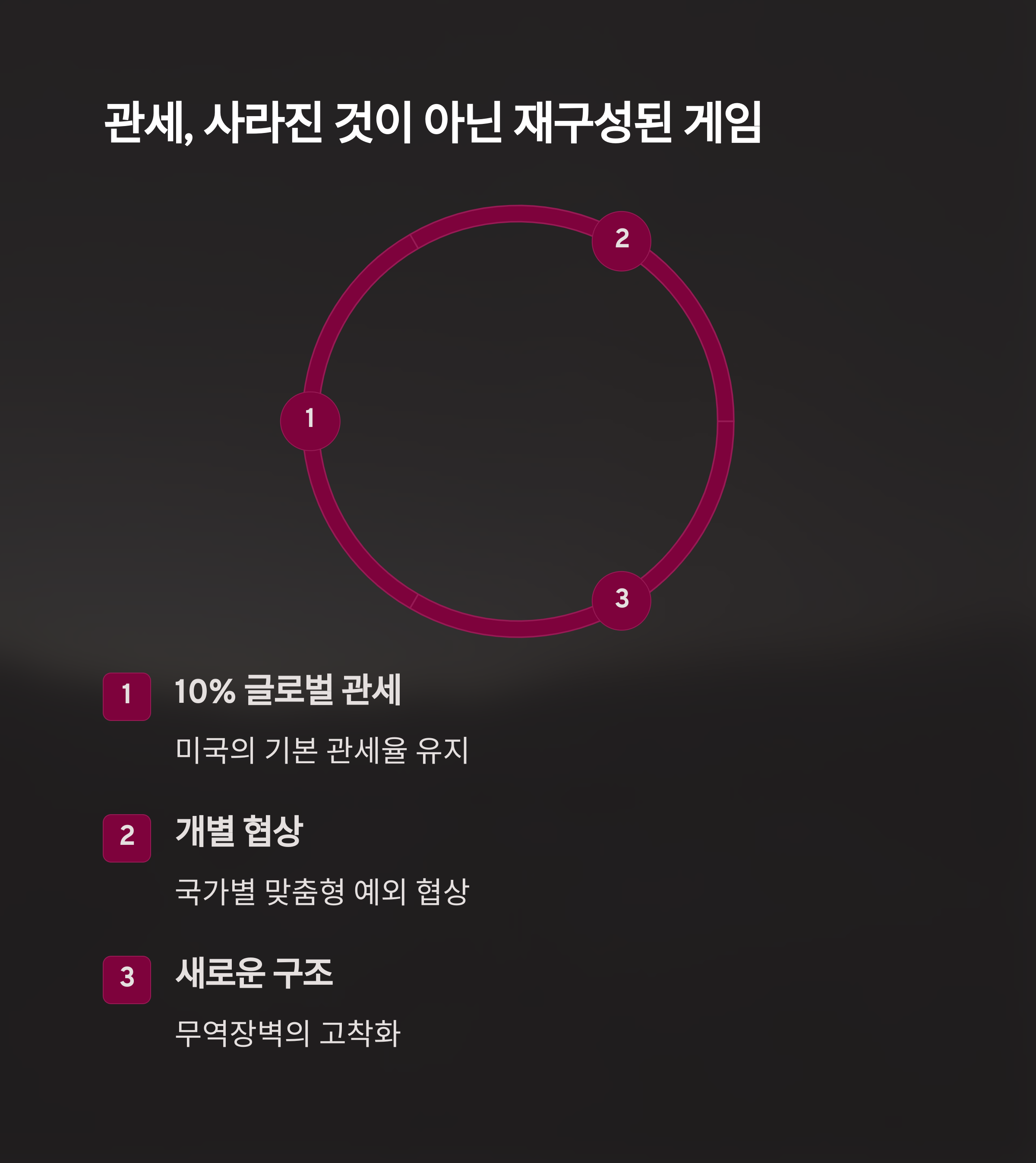 하지만 그 이면에는 **‘관세를 협상의 수단으로 고정화한 전략’**이 자리잡고 있습니다.