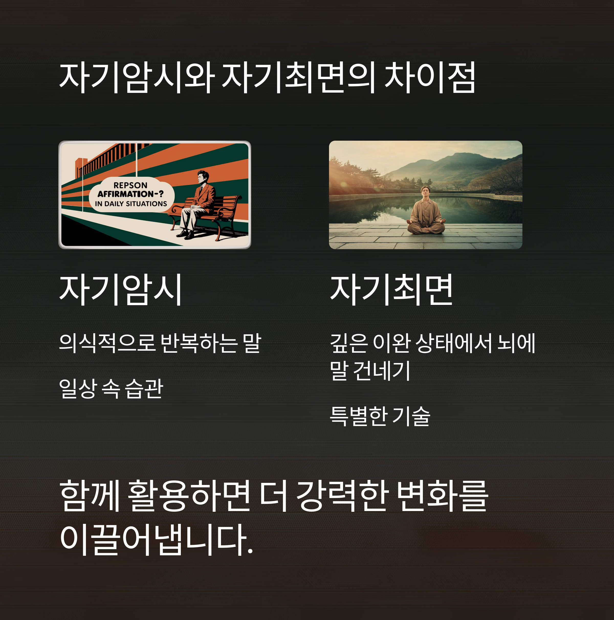 자기암시는 스스로에게 하는 말이고, 자기최면은 그 말을 더 깊숙이 스며들게 하는 통로야. 결국 둘은 연결되어 있고, 잘 조합하면 훨씬 강한 시너지를 만들 수 있어.