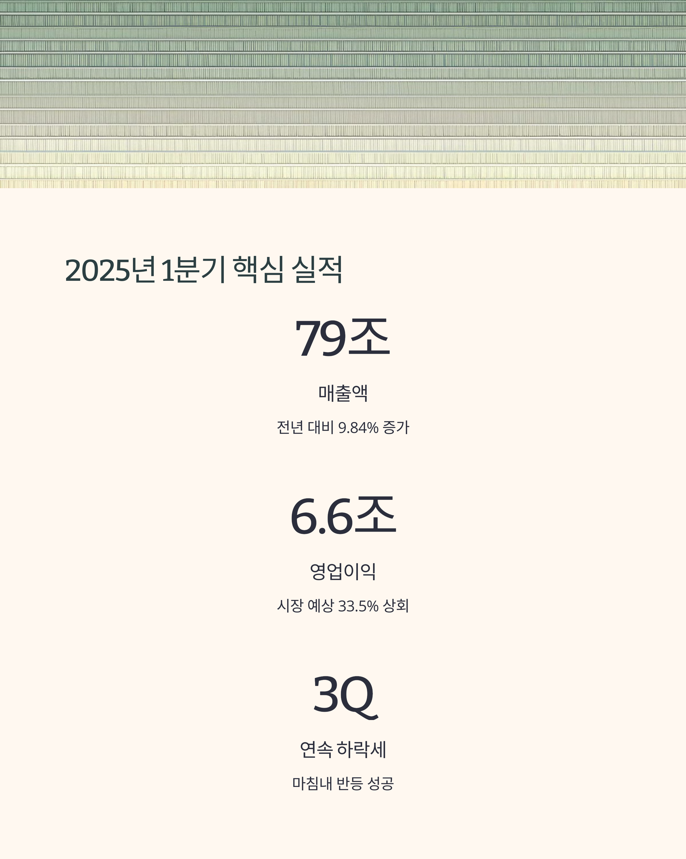 삼성전자는 2025년 1분기 연결 기준 영업이익 6조 6,000억 원, 매출 79조 원을 기록했습니다.