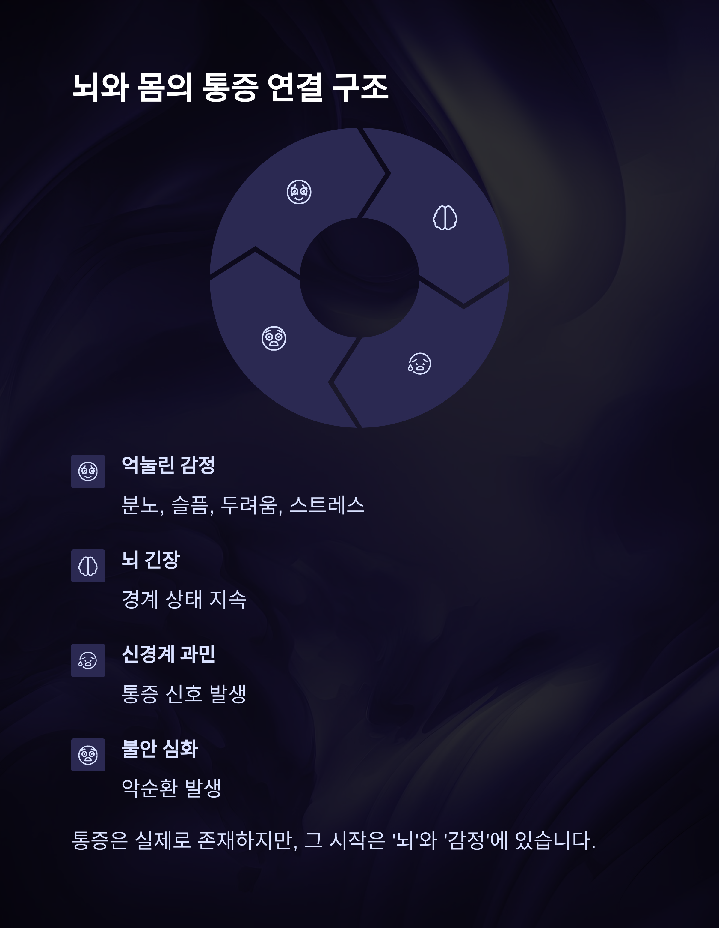 즉, 통증은 진짜로 '존재'하지만, 그 출발점은 우리 몸이 아닌 '뇌'와 '감정'이라는 거예요.