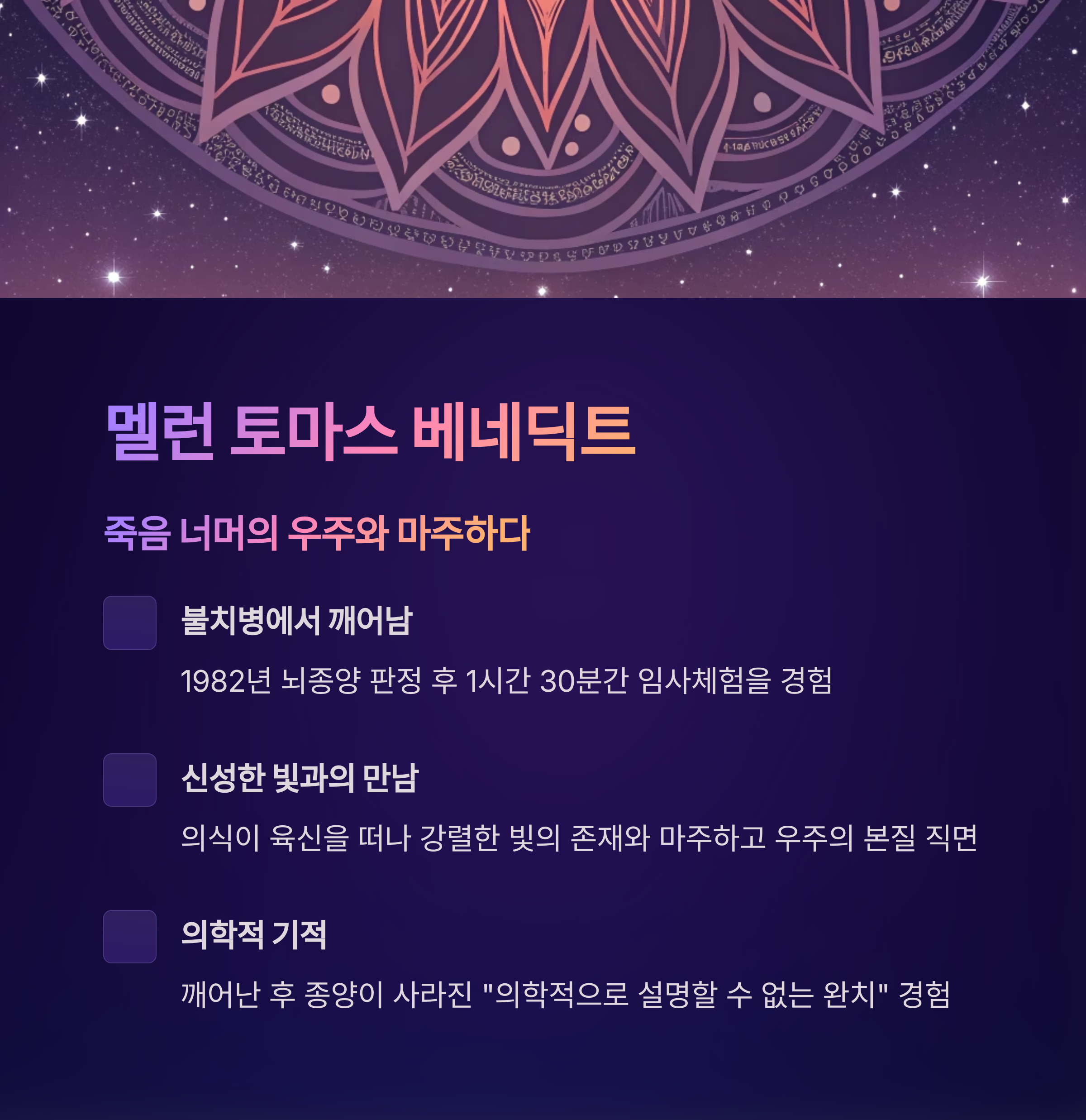 예술가였던 멜런 토마스 베네딕트는 1982년 불치의 뇌종양 판정을 받고 임종을 준비하던 중, 약 1시간 30분간 의식을 잃고 임사체험을 했습니다. 그는 체험 속에서 자신의 의식이 육신을 떠나 신성과 같은 강렬한 빛의 존재와 마주했고, “우주를 이루는 인간 영혼의 거대한 만다라” 같은 형상을 보며 깊은 통찰을 얻었다고 말합니다.