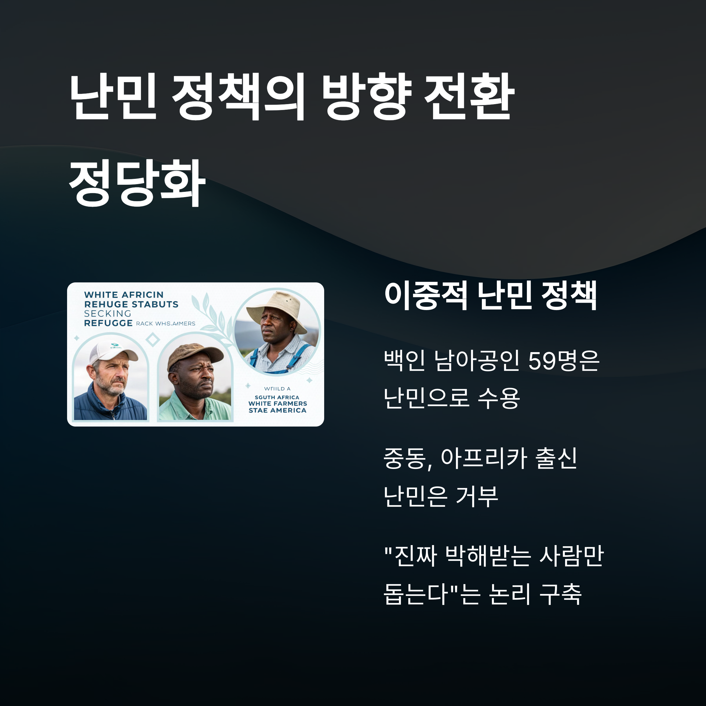 트럼프 행정부는 최근 백인 남아공인 59명을 난민으로 받아들였습니다. 하지만 동시에 중동이나 아프리카 등에서 온 난민들에 대해서는 문을 굳게 닫고 있습니다. 인종 차별적이라는 비판을 피하기 위해 그는 남아공 영상을 근거로 내세운 것입니다.
