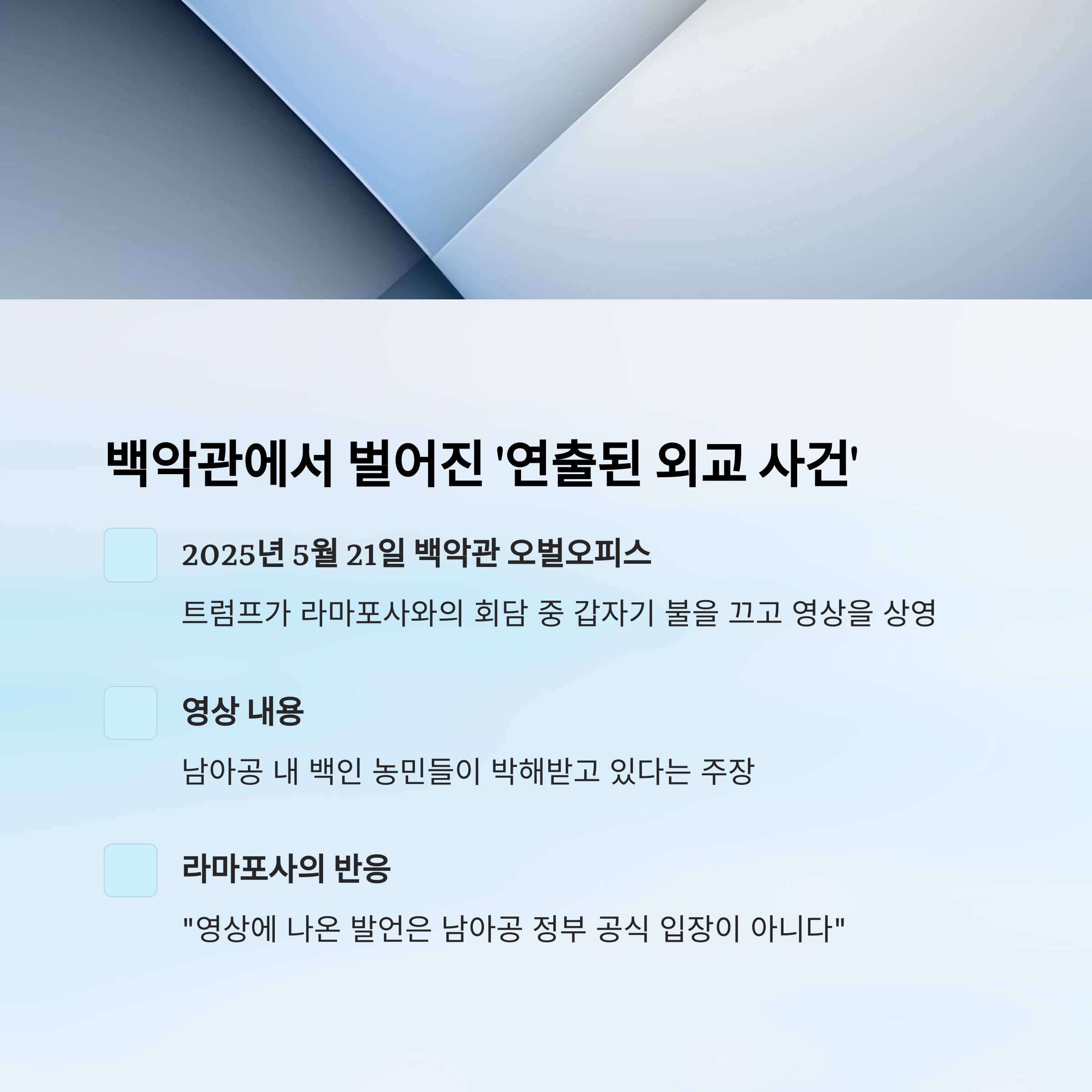 라마포사는 예상치 못한 공격을 받았고, 회담은 본래 목적이었던 경제 협력이나 외교 조율 대신 트럼프의 메시지 확산이라는 결과만 남겼습니다.