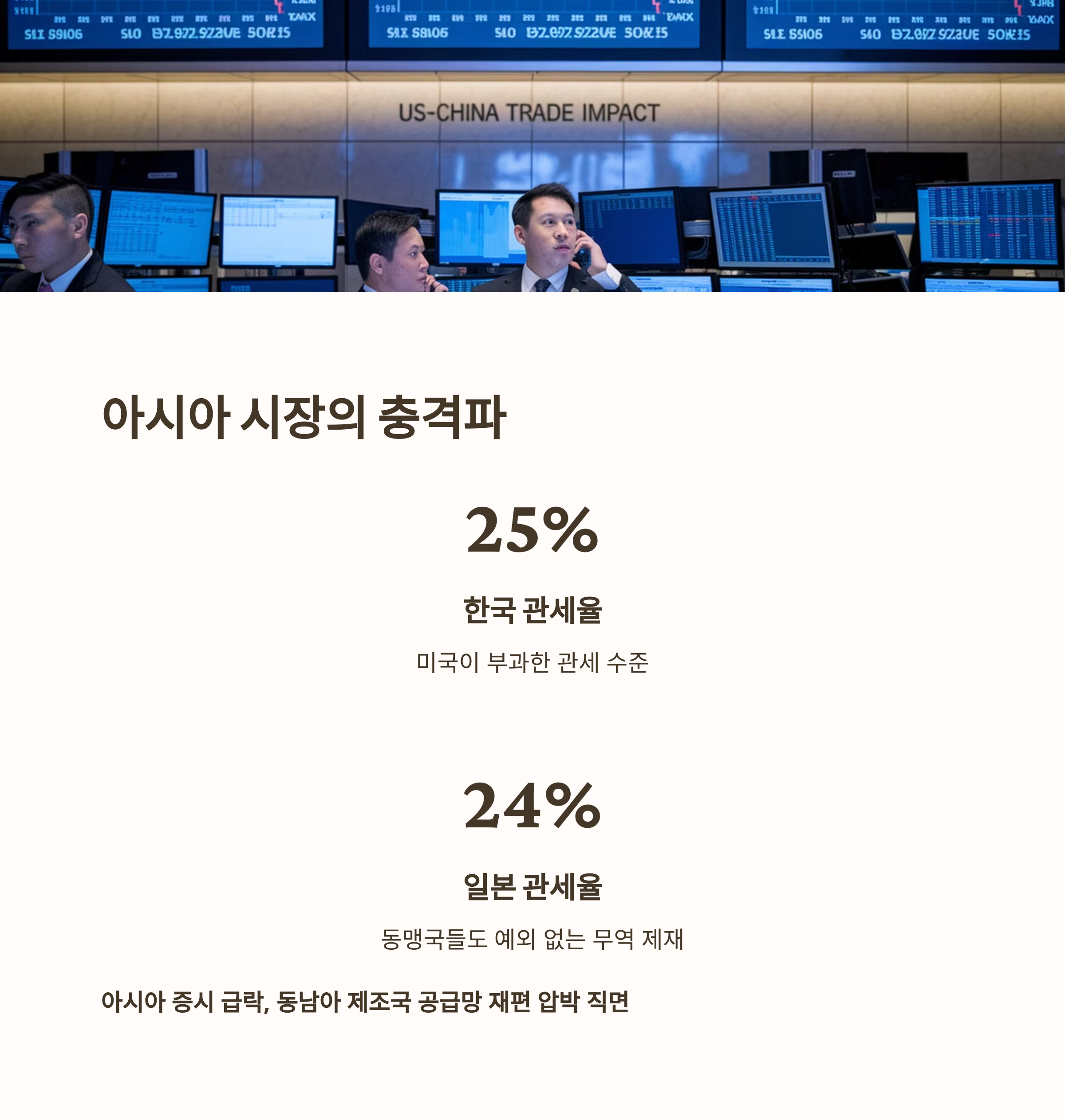 트럼프의 발표 직후, 아시아 증시는 도쿄와 홍콩을 중심으로 급락세를 보였습니다. 한국과 일본은 각각 25%, 24%의 관세를 부과받았고, 동남아 제조국들도 공급망 재편 압박에 직면하고 있습니다.