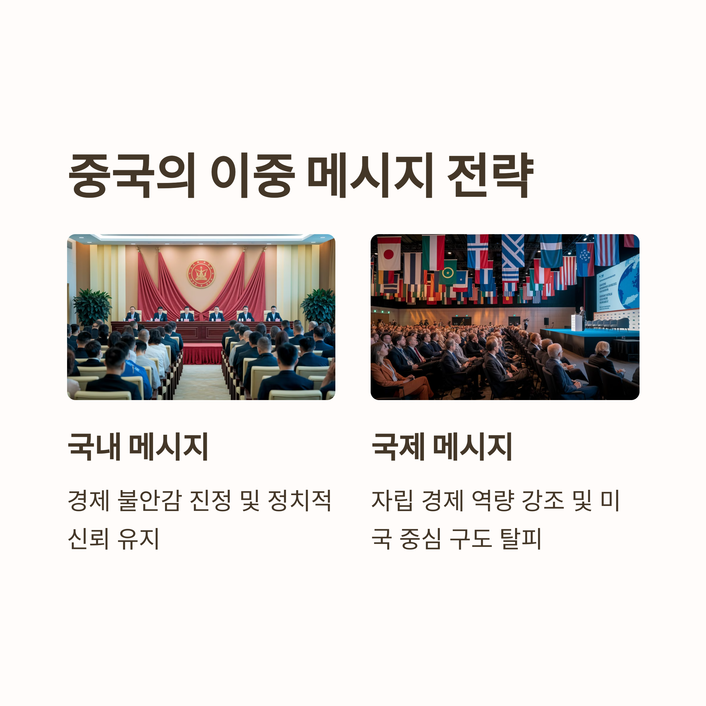 - 국제: 중국의 자립 경제 역량을 강조하고, 미국 중심 구도에서 탈피