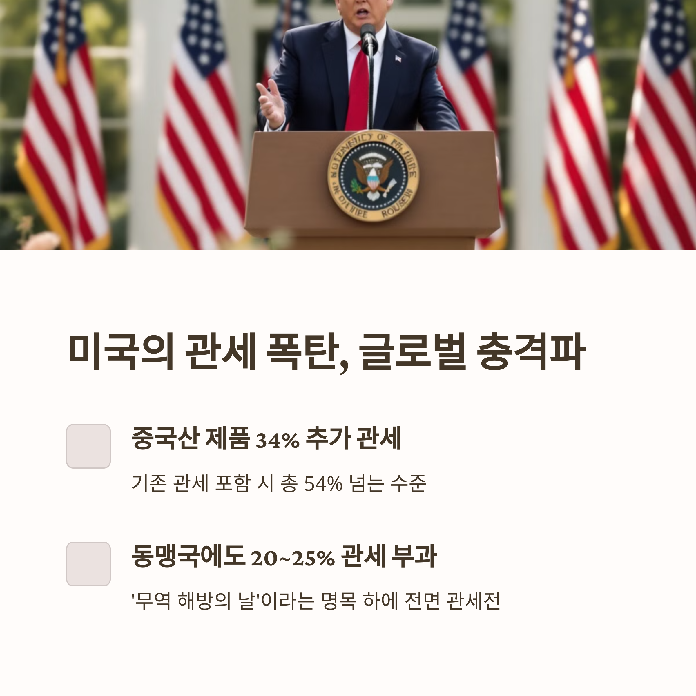 2025년 4월 2일, 백악관 로즈가든에서 트럼프는 중국산 모든 제품에 대해 34% 추가 관세를 발표했습니다. 기존 관세를 포함하면 중국산 제품에 대한 전체 관세는 54%를 넘어서며, 동맹국들에도 각각 20~25%의 관세가 부과됐습니다.