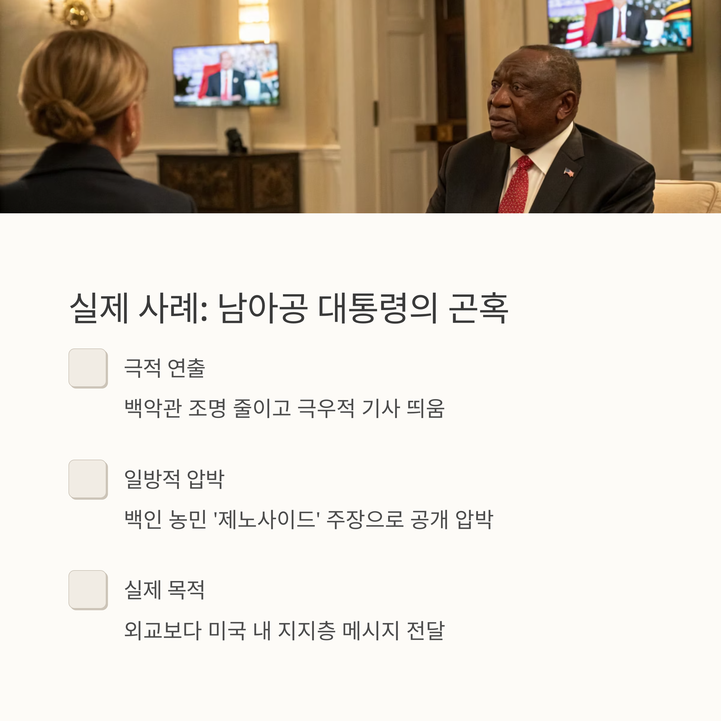 대표적 사례는 2025년 5월, 남아공 대통령 시릴 라마포사의 백악관 방문이었습니다. 트럼프는 회담 중 백인 남아공 농민이 ‘제노사이드(집단학살)’의 피해자라며 라마포사에게 공개적인 압박을 가했습니다. 백악관 집무실의 조명을 줄이고 극우적 기사들을 멀티미디어로 띄우는 장면은, 더 이상 회담이 아닌 일종의 ‘선전 방송’이었습니다.