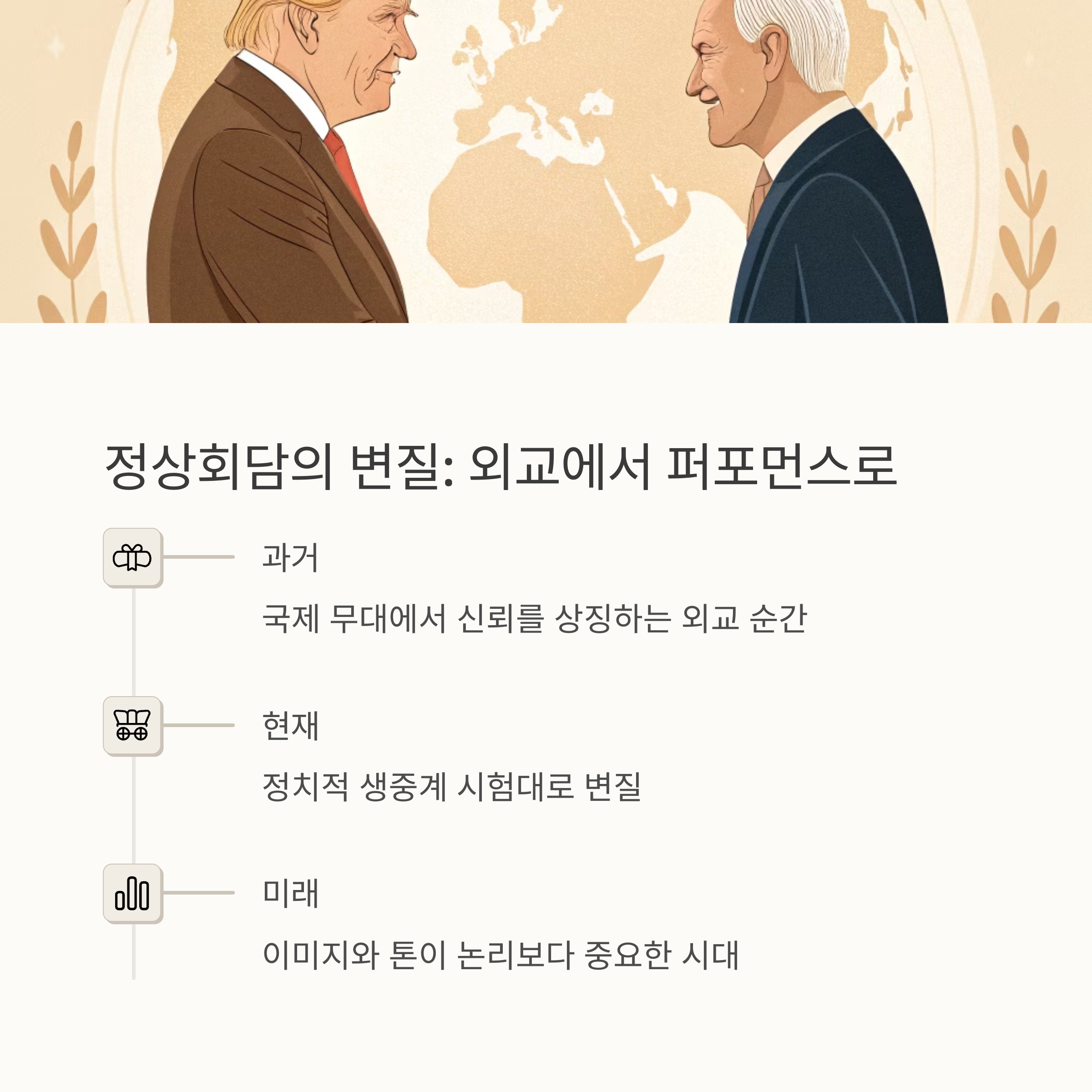 한국 대통령이 그 무대에 선다면, 중요한 것은 회담에서 무엇을 말했는가보다, 카메라 앞에서 어떤 장면이 남았는가일 수 있습니다. 이는 단순한 외교가 아닌, 정치 커뮤니케이션의 시대가 왔다는 신호입니다.