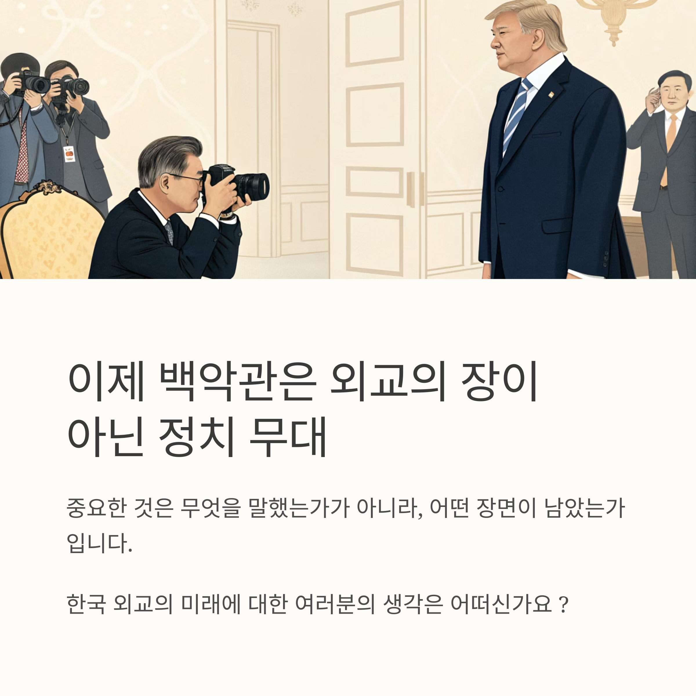 한국 대통령이 그 무대에 선다면, 중요한 것은 회담에서 무엇을 말했는가보다, 카메라 앞에서 어떤 장면이 남았는가일 수 있습니다. 이는 단순한 외교가 아닌, 정치 커뮤니케이션의 시대가 왔다는 신호입니다.
