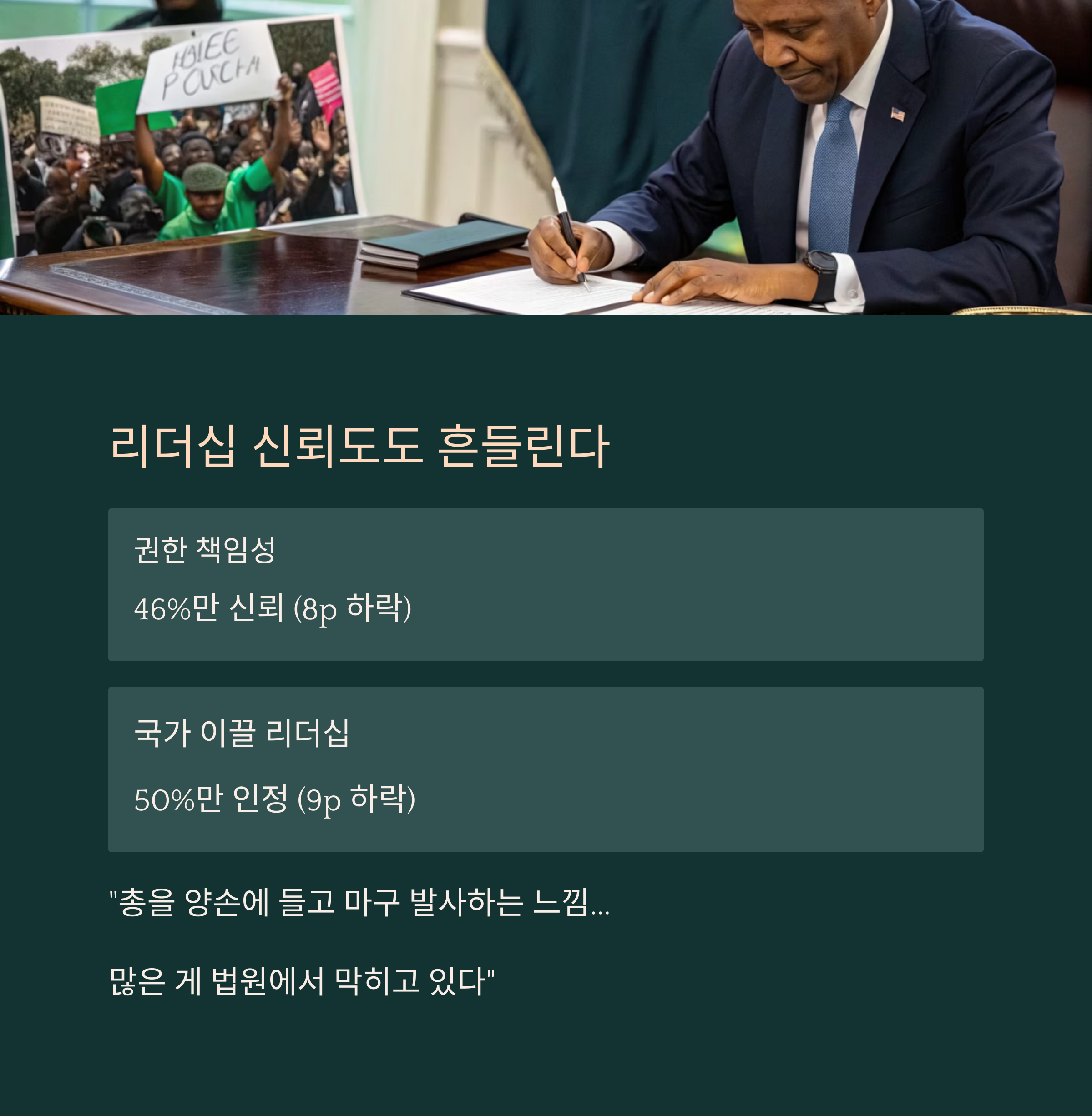 - 대통령 권한을 책임 있게 쓸 것인가: 46% (8p 하락)