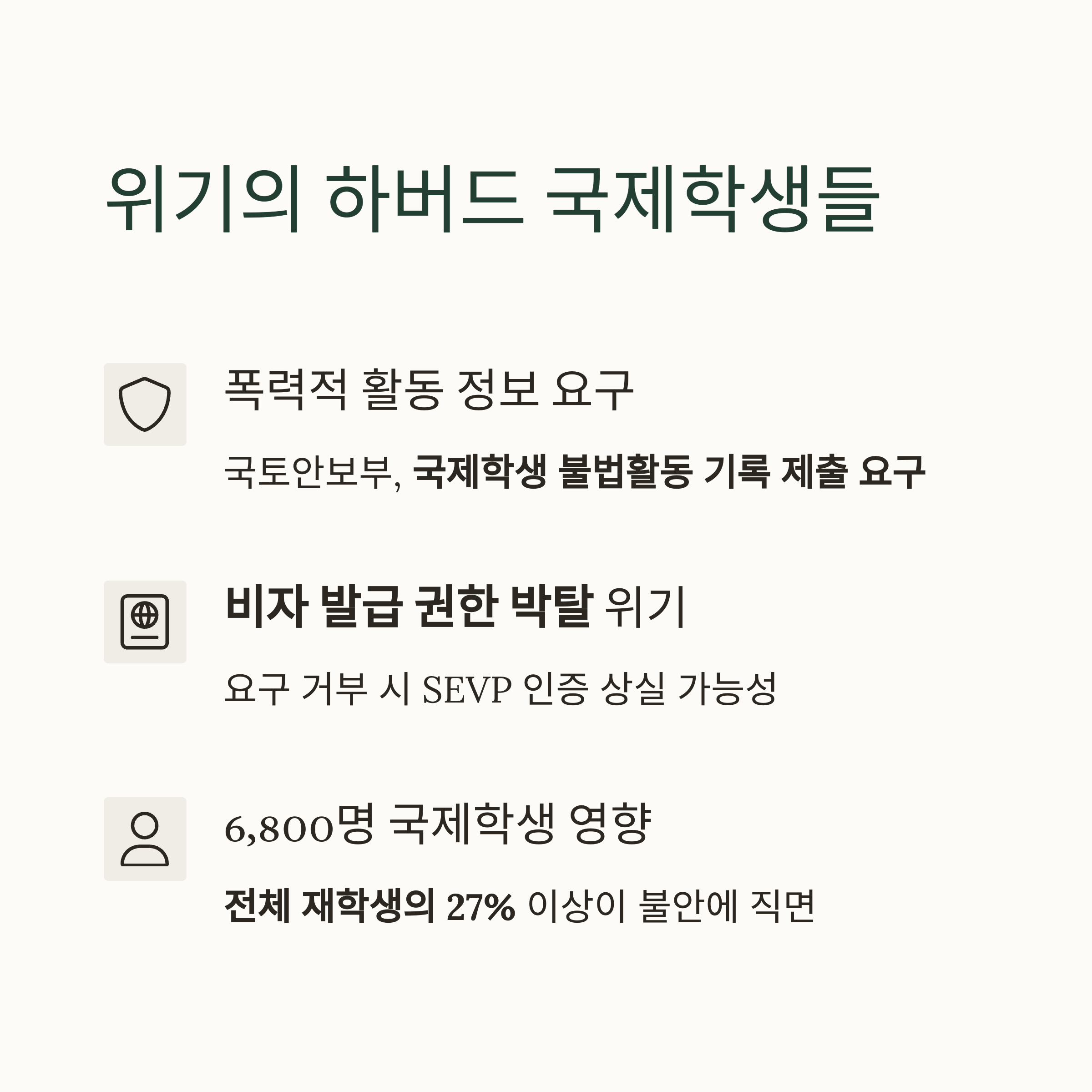 유학생 비자가 단순한 이민 이슈를 넘어, 정치적 입장과 연결된 수단으로 사용되고 있습니다. - 학교 자율성 vs 연방 권력의 충돌
