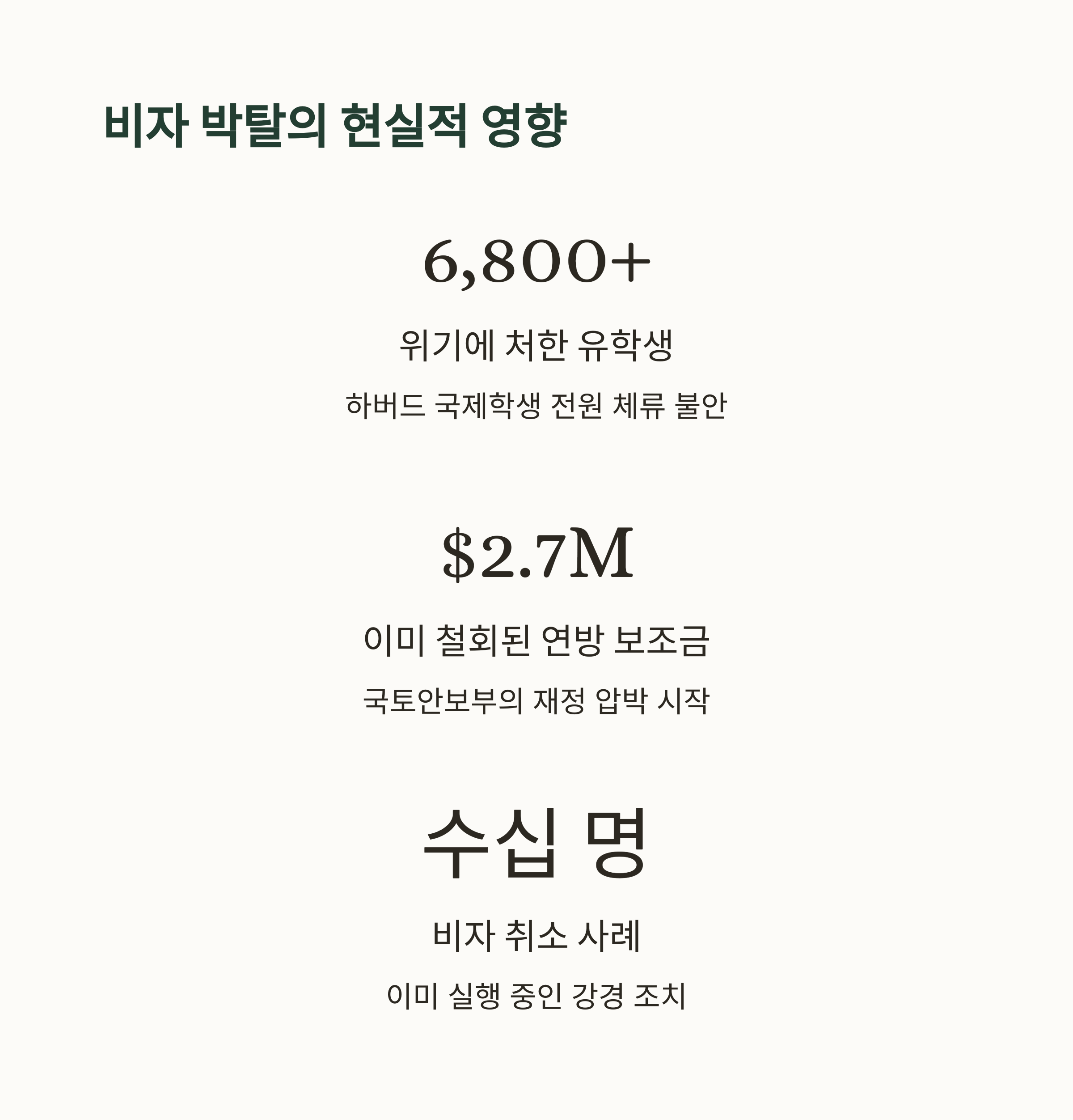 하버드는 현재 약 6,800여 명의 국제학생이 재학 중이며, 이는 전체 재학생의 27%가 넘는 숫자입니다. 비자 발급 권한이 사라지면, 신규 유학생을 받을 수 없고, 현재 학생들 또한 체류 문제가 발생할 수 있습니다.