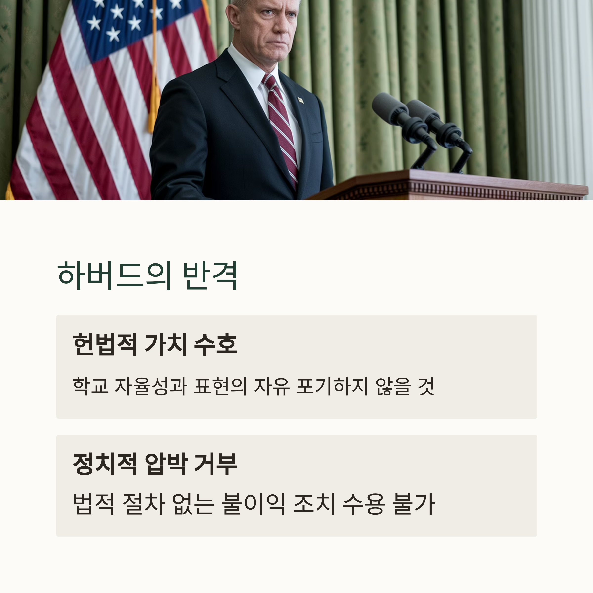 하버드는 이를 헌법적 권리 침해라고 맞서고 있으며, "학교의 독립성을 포기하지 않겠다"고 밝혔습니다.
