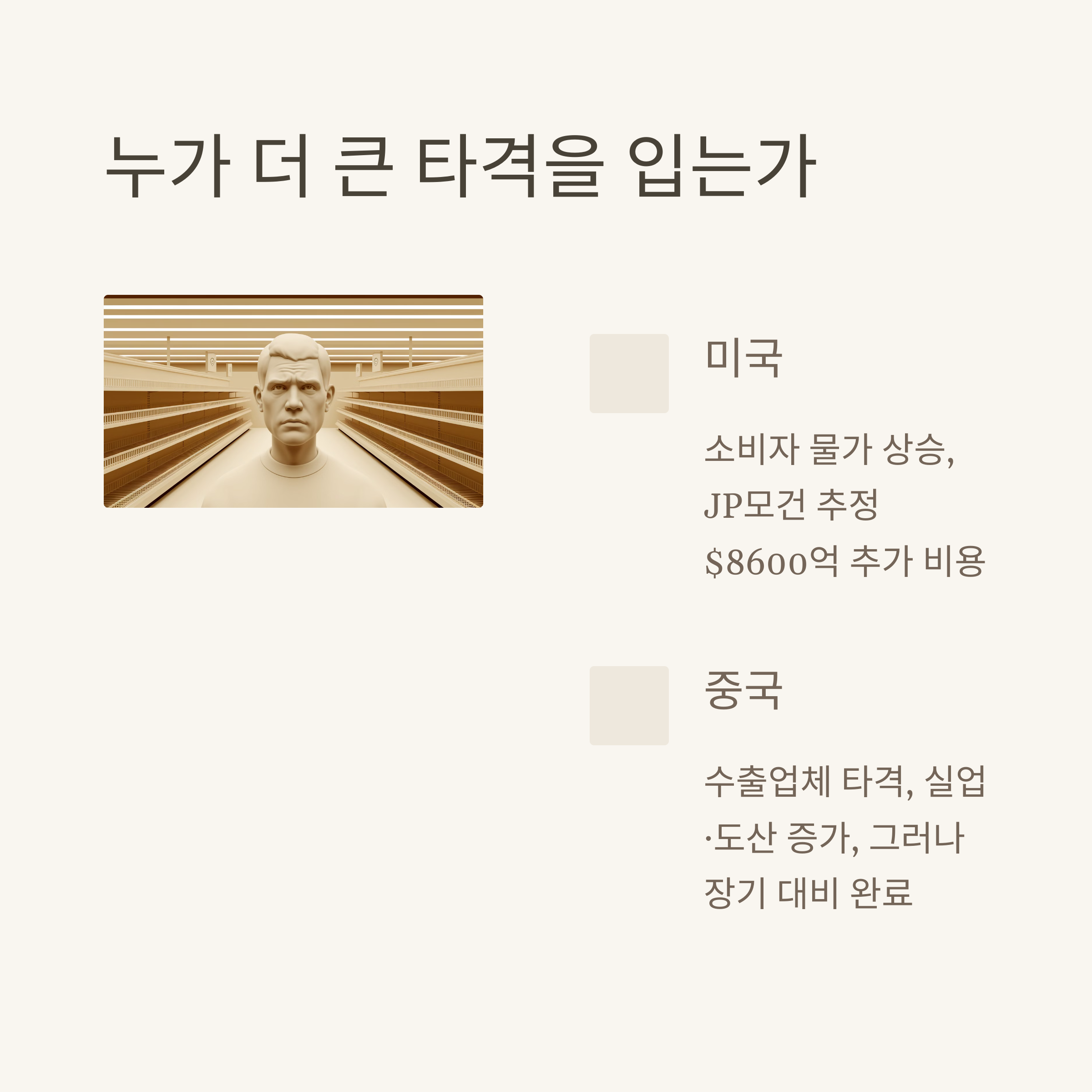 | 경제 충격 | 미 소비자 물가 상승 예상 ($8600억 추가 비용 추정 - JP모건) | 中 수출업체 타격, 실업·도산 증가 전망 but 정치적 인내 가능 |