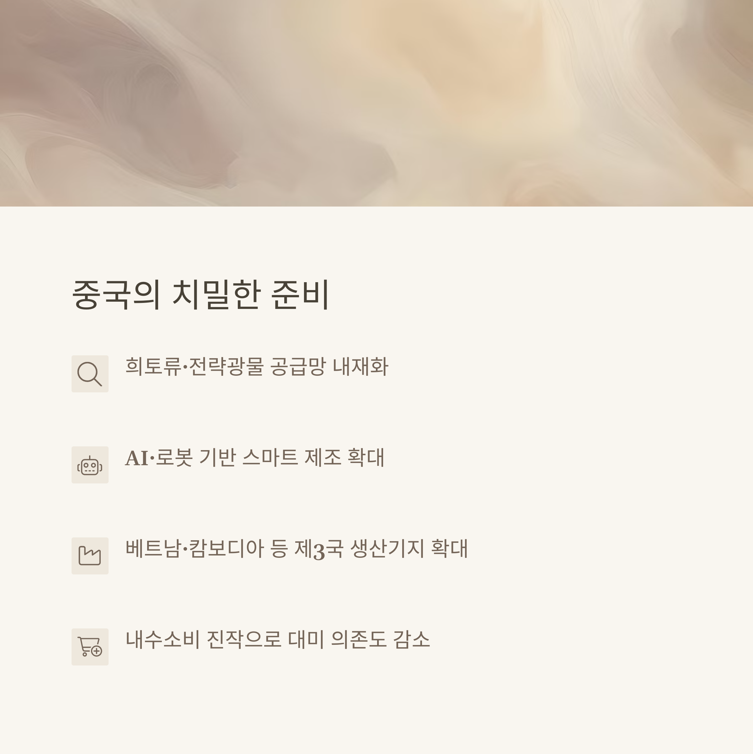 | 주요 무기 | AI, 반도체, 공급망 장악, 동맹국 압박 | 희토류·전략광물 공급망 자립, 제3국 생산기지 확대, 기술 고도화 |