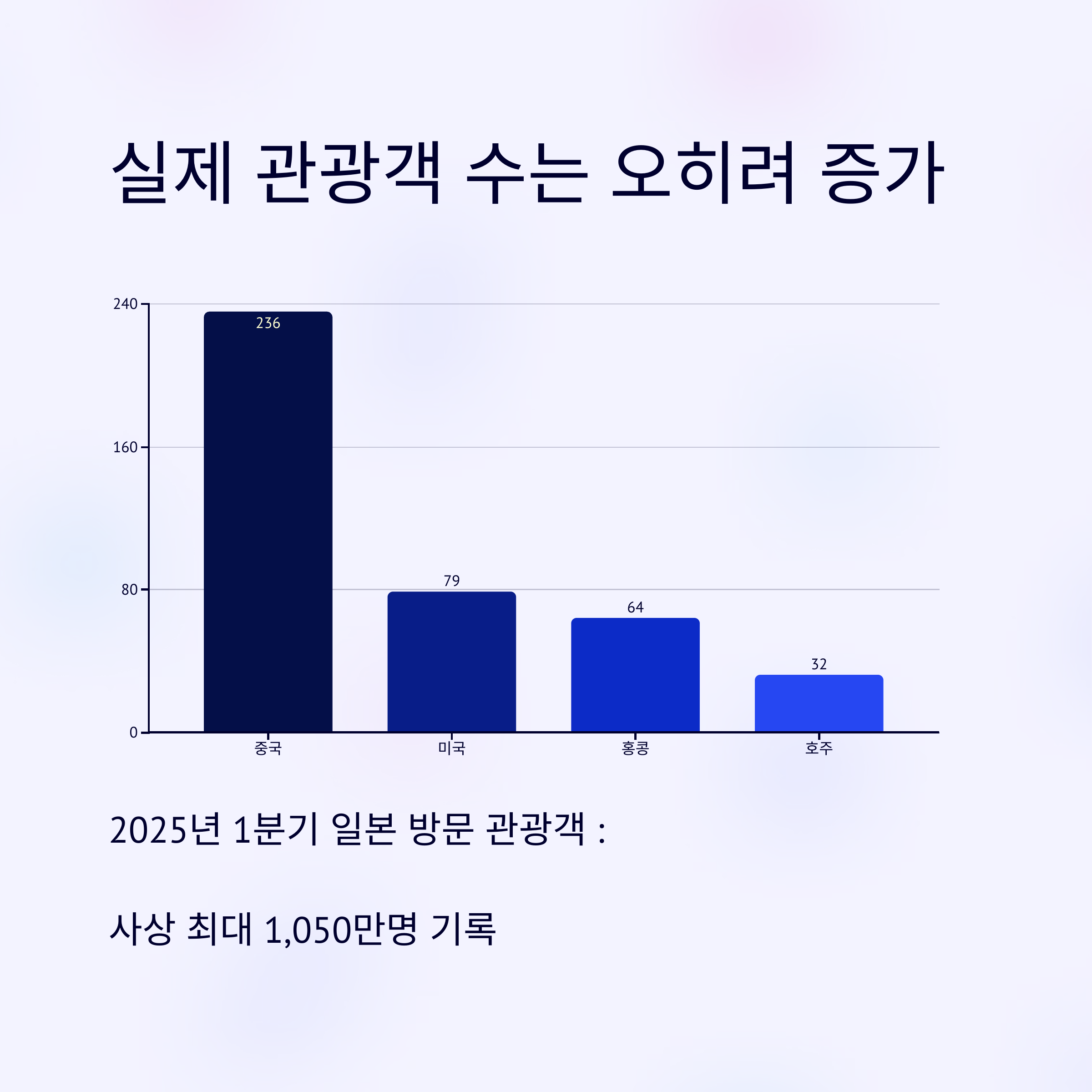 2025년 1분기, 일본은 1,050만 명의 해외 관광객을 맞이하며 사상 최대치를 기록했습니다. 중국 본토에서 온 여행객은 전년 대비 78% 증가한 236만 명, 홍콩에서도 3.9% 증가한 64만여 명이 방문했다고 합니다.