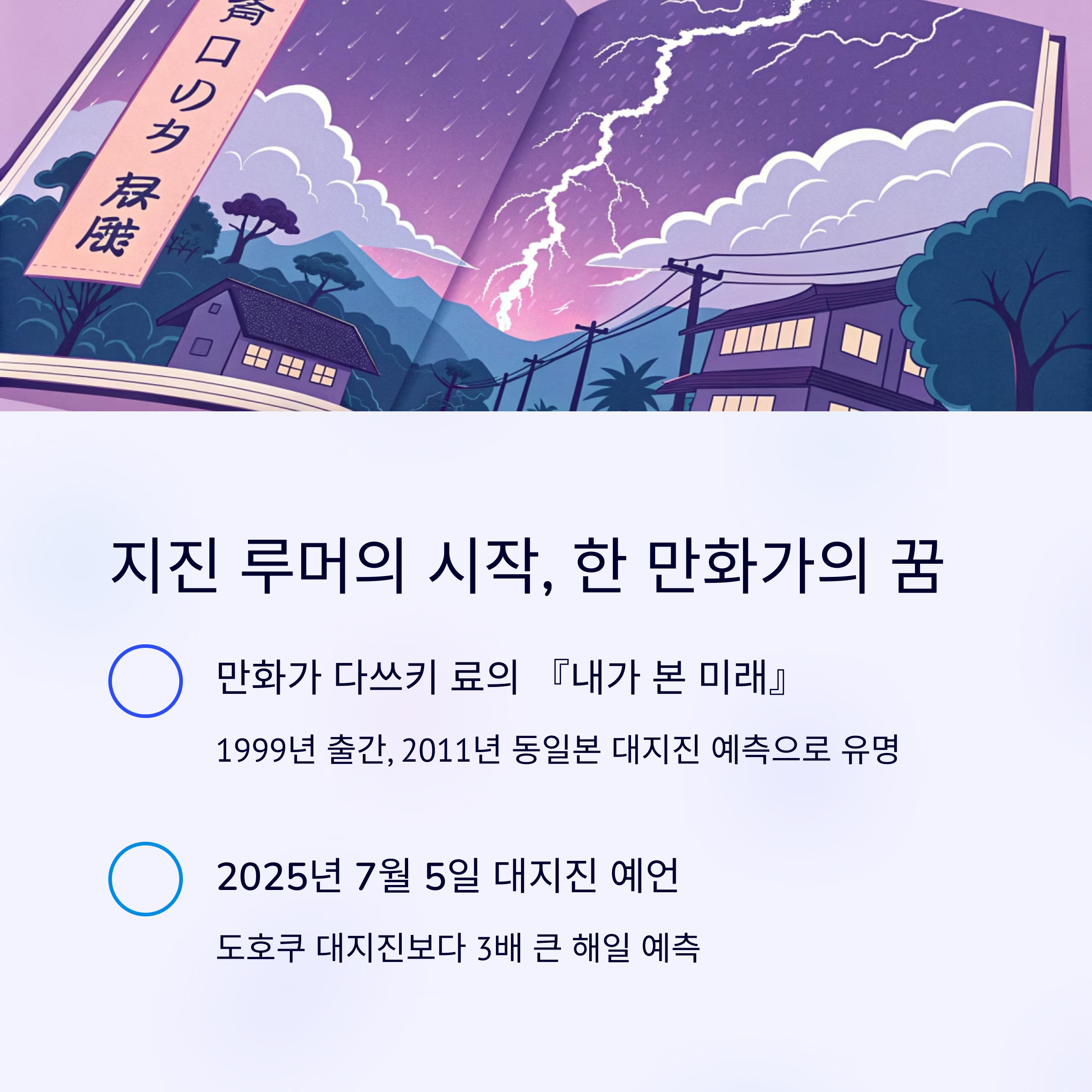 이번 혼란의 중심에는 일본 만화가 다쓰키 료(竜樹諒)가 있습니다. 그녀는 1999년에 출간한 만화 『내가 본 미래』(The Future I Saw)에서 “2011년 3월 대재해”를 예고했다고 여겨지며 유명세를 탔습니다. 당시 만화 속 예언은 2011년 동일본 대지진과 놀랍게도 시기가 맞아떨어졌고, 이후 많은 사람들이 그녀의 꿈을 예언으로 받아들이기 시작했습니다.
